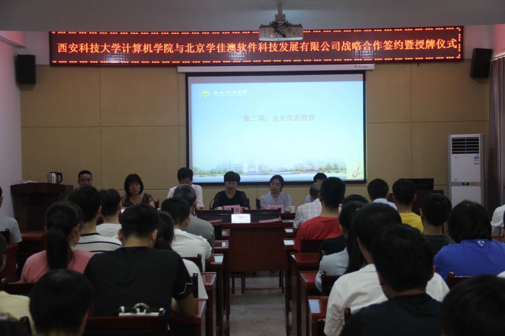 2018年9月4日,建校60周年华诞来临之际,计算机公司与北京学佳澳软件科技有限公司战略合作签约暨揭牌和捐赠仪式在临潼校区会议室举行。北京学佳澳软件科技有限公司院校总监、运营经理,高级讲师,计算机公司党政领导等参加会议。会议由党委副书记陈伟伯主持。