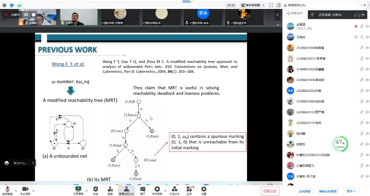 由于无界Petri网状态空间的无穷性,其可达状态不能用传统的可达图进行描述,因此,无界Petri网的可达性问题成为无界Petri网状态行为分析中的核心和难点问题之一。报告中,王寿光教授结合多年的科研经验从无界Petri网可达性问题早期的研究成果讲起,针对无界Petri网的可达性问题进行了深入的讲解。王教授通过对状态树、改进状态树和新型改进状态树这三类描述无界Petri网状态空间的结构进行分析和比较,向同学们展示了解决无界Petri网可达性问题的有效求解方式,和未来研究的若干拓展方向和思路。最后,王教授结合自身科研经验向同学们进行了科研选题方面的指导,并与公司师生针对Petri网的可达性问题进行了热烈讨论。