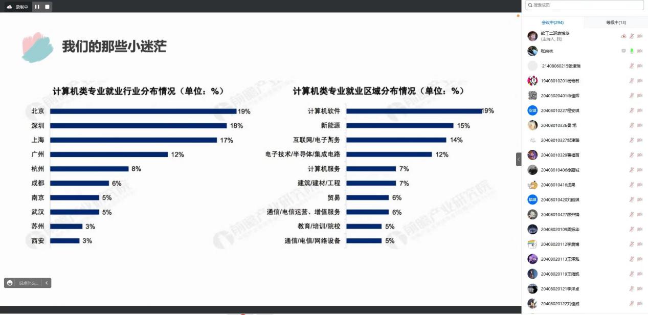 张宗林结合自身在校期间学习计算机专业知识的经历,回应了员工关注的“迷茫”问题,结合职业经历对计算机行业现状、毕业生就业考研方向选择、招聘中的职场技巧等方面进行讲解,勉励同学们认清形势、耐住寂寞、坚持不懈、苦修内功,做到以梦想为光,行稳致远。