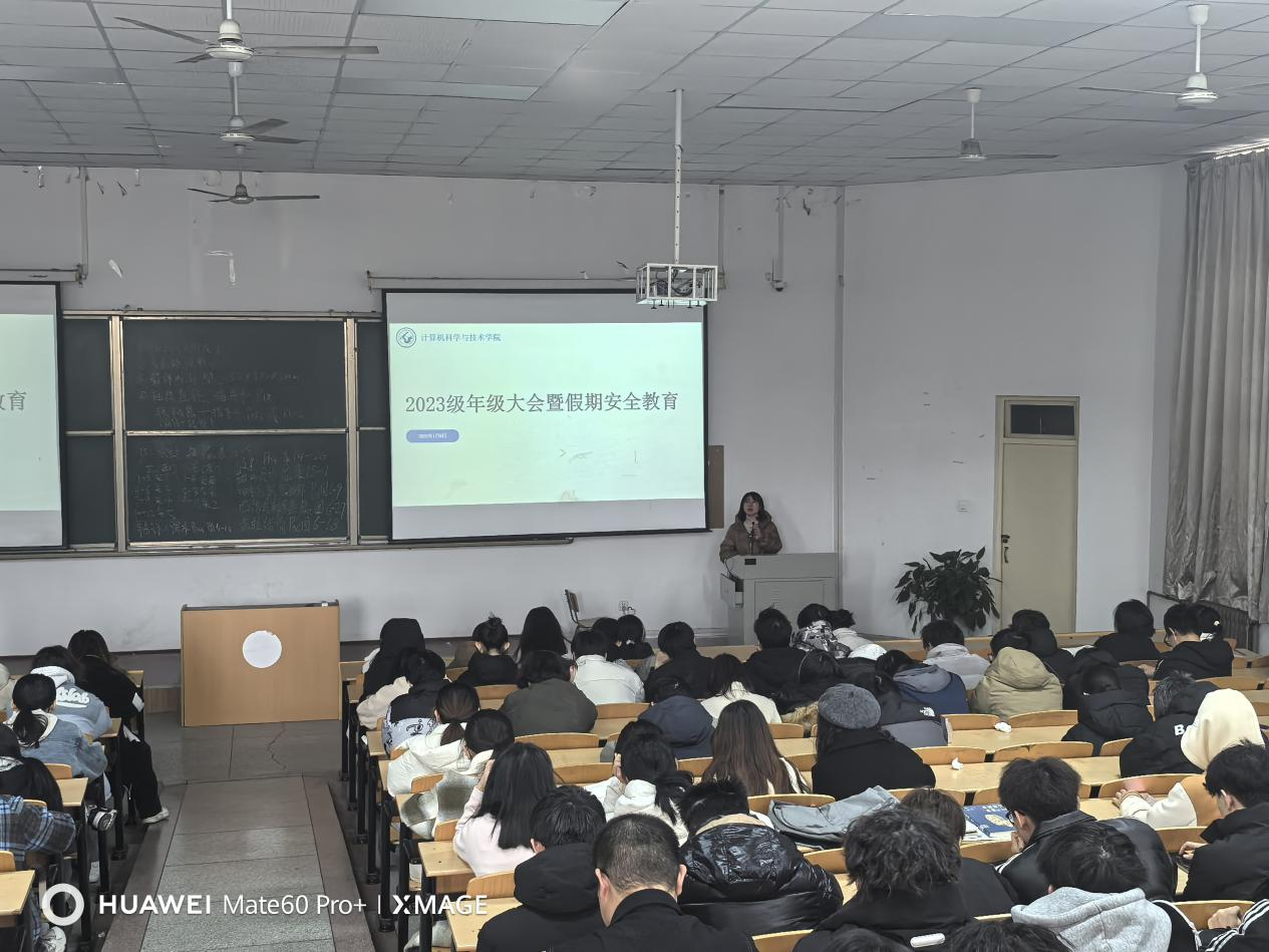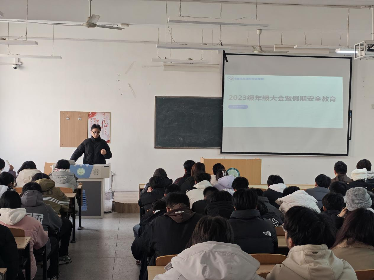 1月9日中午,计算机公司在9号教学楼101、205教室开展2023级本科生寒假安全教育暨科技竞赛宣讲。软件工程系党支部书记史晓楠,公司学工办主任、团委书记张晶晶,辅导员鞠纪元,2023级全体本科生参加会议。